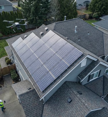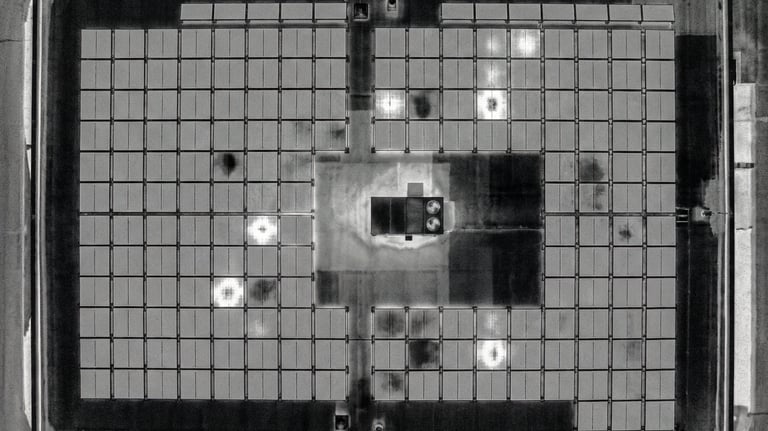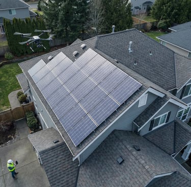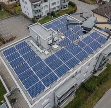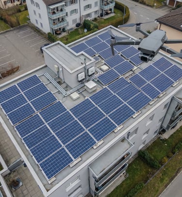 Dron może wspierać ocenę stanu modułów PV, wychwytywanie widocznych nieprawidłowości oraz dokumentację instalacji na dachach budynków i w większych systemach fotowoltaicznych.
